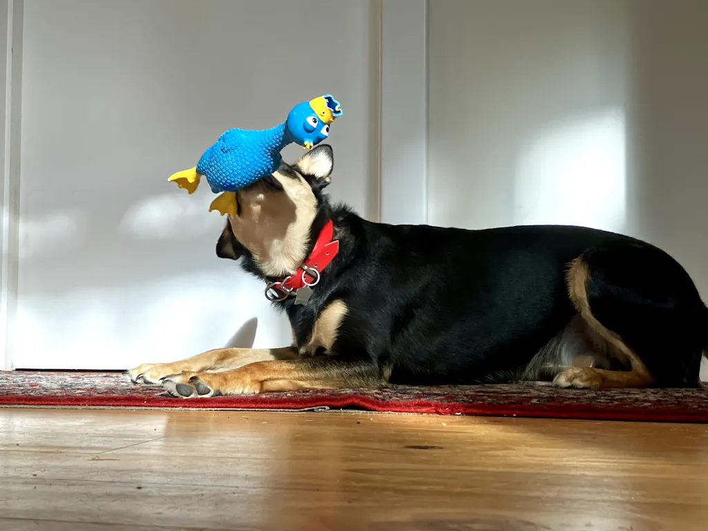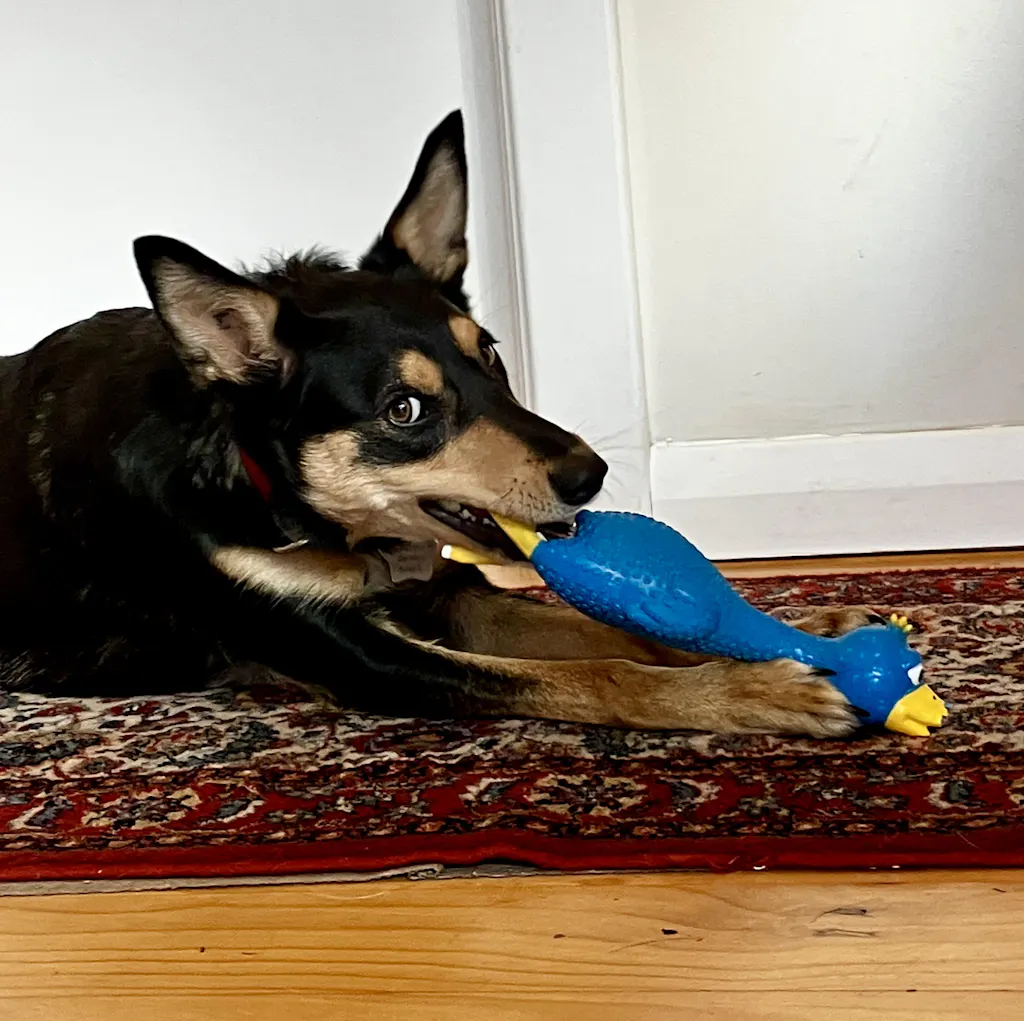 My young kelpie loves this squeaky duck more than any other toy. The extraordinary tone of its squeak is just the thing to get her almost hysterical with excitement and even tho it is a soft rubber she hasn’t destroyed it unlike most of her other toys. It is hilarious watching her.