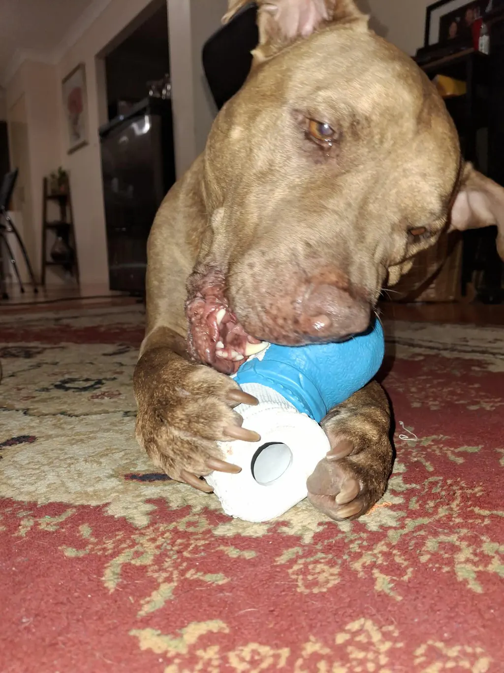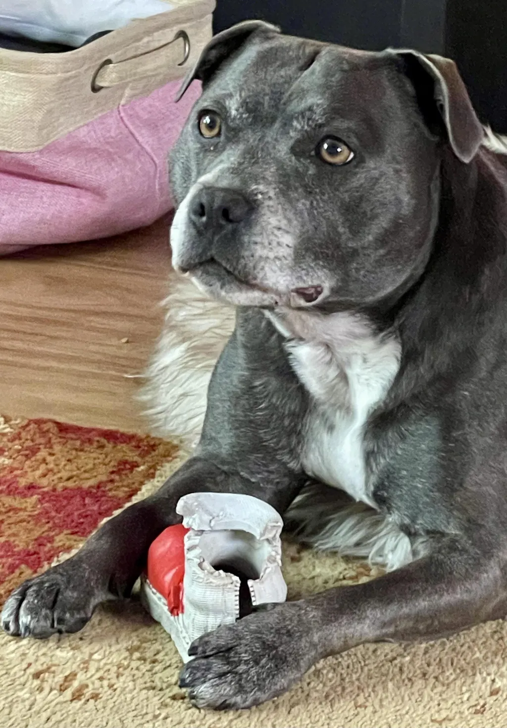 My Staffy gives this shoe a good workout with her jaws . Despite chewing on it often it is still in one piece 👏👍Finally found a Staffy proof toy .She loves it